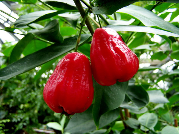 莲雾(Syzygium sp.)又名洋蒲桃,是桃金娘科常绿小乔木,树高5~15米,树冠圆形。原产马来半岛、安达曼群岛,是著名的热带水果。果实呈钟形或梨形,果肉海绵状,多汁,略有香气,味道清甜爽口,是夏季优良的清热消暑佳果。开花有香味,果形美,挂果期长,是优良的热带水果和美丽的园林观果树种。