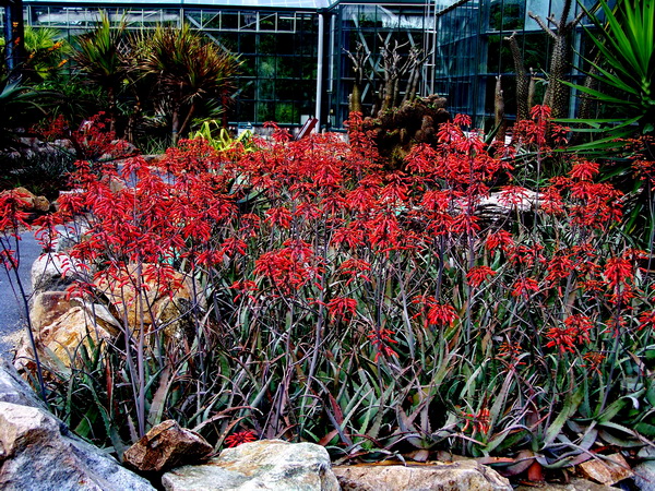 原产非洲热带干旱地区的芦荟在华南地区大都在2-3月份开花。异色芦荟开花性状很整齐,花期一到,齐刷刷地伸出花茎,美丽的红花密密地长在细长的花茎上。成片种植的异色芦荟开花构成一道独特的风景线,放眼望去,红艳艳的一片,灿烂无比,非常醒目,把大地装扮得热闹非凡。单朵小花钟状下垂,尖端开裂,伸出黄色的花芯,像美丽的小喇叭,微风中轻轻摆动,风姿绰约,楚楚动人。