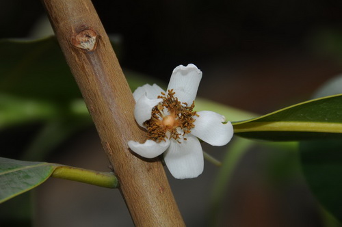 琼崖海棠(Calopwyllum inophyllum linn)属藤黄科(Guttiferae)常绿乔木,又名红厚壳,盛产于我国的海南省和台湾省,为优良的庭园观赏及海岸防护林树种。其树冠锥形至伞形,树皮厚,呈灰褐色或暗褐色,有纵裂缝,创伤处常渗出透明树脂;叶厚革质,阔椭圆形至倒卵形,顶端钝形、圆形或微缺,基部钝形,两面均有光泽,全缘;叶柄粗壮;其花白色,金黄色花蕊群聚于中部,散发着芳香,跟我们熟悉的茶花有几分相识,衬托着浓绿的叶子很是特别。花期通常在八月,持续两周左右的时间。花谢后结出一颗颗绿色球型的核果,成熟的核果变成黄褐色,果实略有甜味,可生食,未成熟的果实可用糖腌制后再吃。