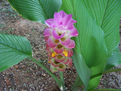 姜黄(Curcuma longa)是姜科姜黄属多年生草本植物,植株丛生,株高1—1.5米;根茎发达,根粗壮,末端膨大呈块根,椭圆形或圆柱状,橙黄色,极香;每株5—7片叶,叶片长圆形或椭圆形,长30—90cm,宽约15cm,绿色,两面均无毛;穗状花序圆柱状,长12—18cm;苞片卵形或长圆形,长3—5cm,淡绿色,顶端钝,边缘有红晕;花萼长8—12mm,白色,被微柔毛;花冠淡黄色,管长达3厘米,上部膨大,唇瓣倒卵形,长1.2—2cm,淡黄色,中部深黄,花期:8—10月。分布广西、云南、四川等地,生于山谷、溪旁及林边阴湿处。