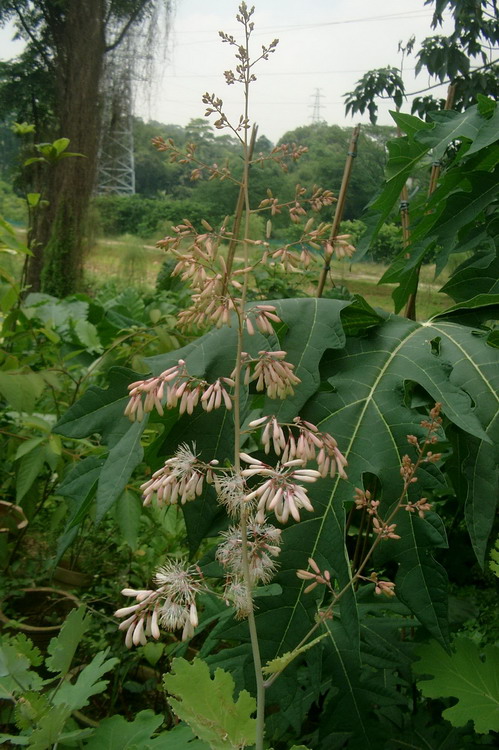 博落回(Macleaya cordata (Willd.)R.Br.)又名号筒树、三钱三等,是罂粟科博落回属多年生草本。茎高1~4米,中空,绿色,有时带红紫色,带有白粉,折断后有黄汁流出。单叶互生,叶圆心脏形,边缘浅分裂,裂片有粗齿,叶背面呈白色。大型圆锥花序顶生和腋生,多花;萼片白色有时带红色,无花瓣,雄蕊多数,雌蕊1枚。花后结长椭圆形的扁蒴果。花果期6-11月。