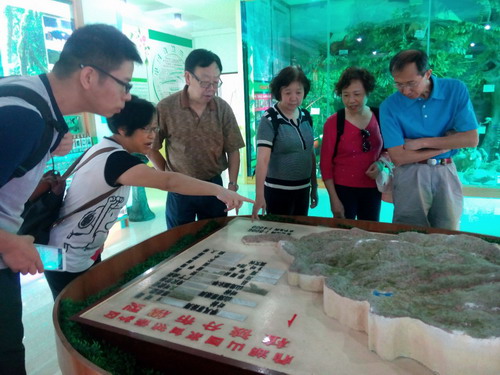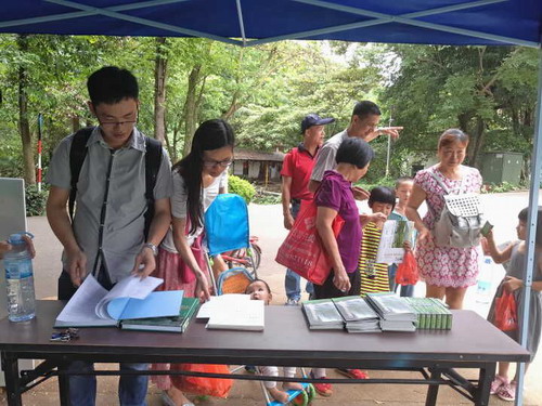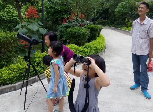 雨后天晴的鼎湖山天蓝地绿风清气爽。游客们在工作人员的引导下兴致勃勃的观看了鼎湖山珍稀濒危动植物展板、濒危龟类保护专题科普展板,观看了中国自然保护区主题展厅,并了解到鼎湖山保护区是中国的第一自然保护区的历史地位以及丰富的生物多样性,增长了他们对动植物的见识工作人员在鼎湖山树木园内架立观鸟望远镜供来访的游客欣赏和观看鸟类,传授观鸟知识。工作人员向游客们赠送了自然保护宣传册、野外观鸟指导手册和图文并茂的鼎湖山常见鸟类科普扑克牌,让他们日常生活中认识生物多样性和保护环境的知识。
