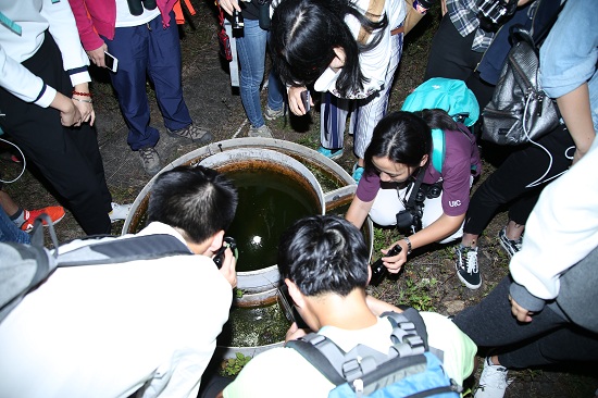 等到夜幕降临,螽斯和蟋蟀争相鸣唱,神奇的夜观开始了。同学们有的手拿电筒,有的头戴探灯,紧随保护区工作人员左右,不一会儿就见到了喜欢在夜色浓稠里出没的斑腿泛树蛙,在强光的照射下一动不动;两只可爱的鸟儿,紧紧相依,在树枝上睡觉,羽毛蓬松,相互取暖,十分温馨。接着,慢吞吞爬行的蜗牛、夜间出来觅食的东风螺、长相怪异的象鼻虫、水里嬉戏的山坑鱼,以及对周边生活环境质量要求很高的版纳鱼螈,都在我们探索的路上一一呈现。最后,同学们关掉电筒,放开思维,冥想静静的走在森林中,自己与大自然融为一体。