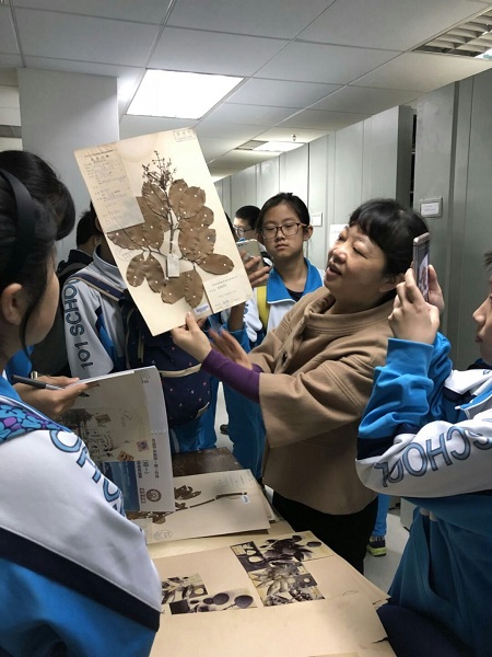 在标本馆曾飞燕和黄向旭老师的带领下,同学们兴致勃勃地走进了平时不对外开放的科研重地——标本馆,从曾老师的解说当中,了解到馆内收藏的100多万份凝聚了数代植物学家的汗水和心血,为南方植物学分类研究奠定了基础。曾经,华南植物园第一任园长陈焕镛在抗日期间为了保护植物标本,舍弃家中财产冒着个人生命危险,将标本从广州转移到香港保存;植物采集家邓世纬在野外采集标本,不幸染病为科学事业献出了宝贵的生命,科学家们的感人事迹令同学们感动不已。在馆内,同学们见识了从1849年穿越170年而来的远志标本、植物活化石“银杉”的模式标本、还有从英格兰越洋过来的珍稀植物标本,在老师的指导下读懂了一份标本所蕴含和承载的科学信息。