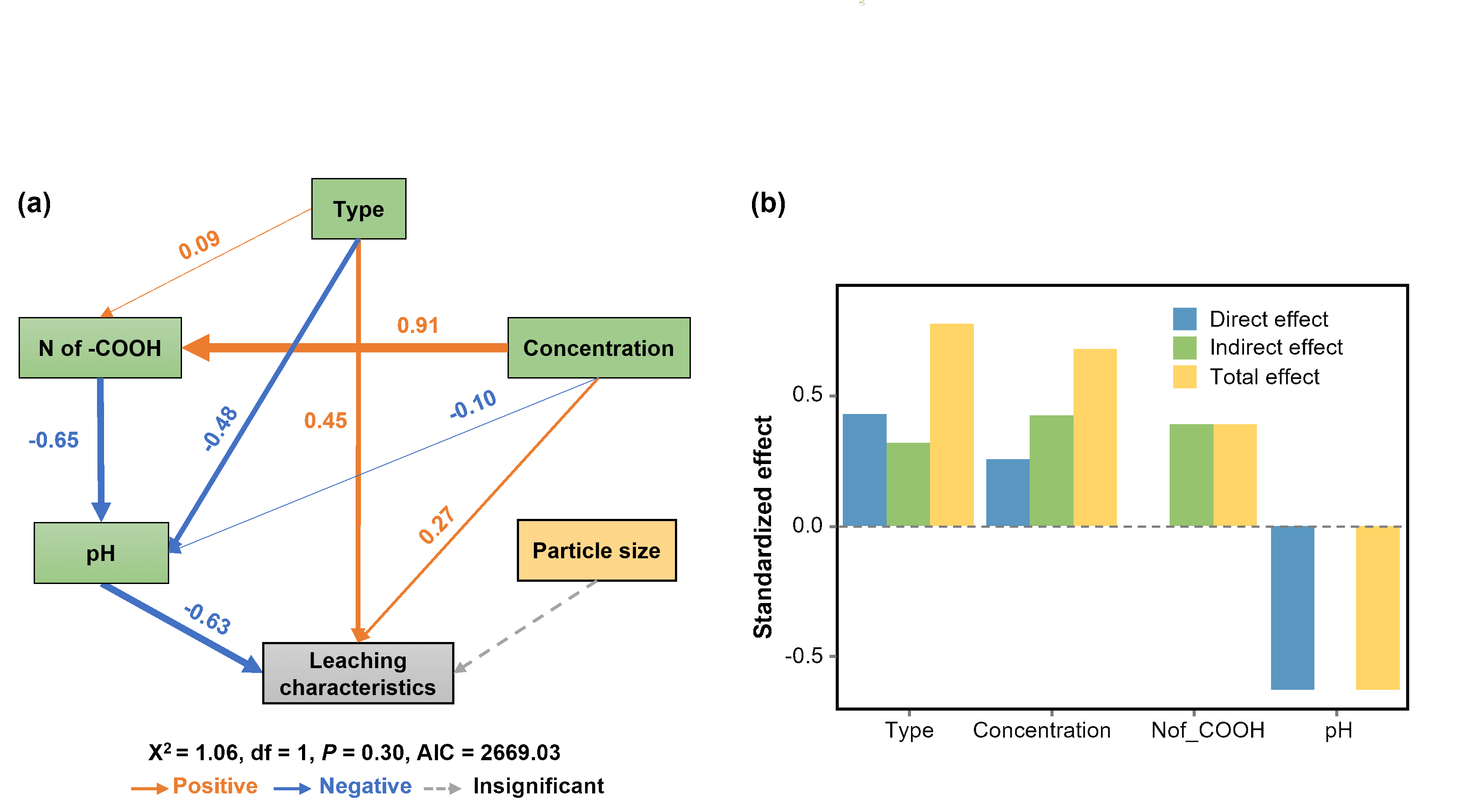 (a)拟合模型及(b)由其总结的驱动因素效应。珊瑚砂风化的驱动因素包括有机酸类型(Type)、浓度(Concentration)、羧基摩尔浓度(N of -COOH)以及溶液初始pH(都用绿色表示),珊瑚砂粒径(橙色表示)。淋溶特性(灰色表示)通过对淋溶液中的Ca、Mg和P浓度以及珊瑚砂质量损失进行主成分分析后取第一主成分表示。羧基摩尔浓度的计算方法为将有机酸分子的羧基数(乙酸、苹果酸、草酸和柠檬酸分别为1、2、2和3)乘以其用于淋溶实验的溶液浓度所得。灰色虚线表示不显著的路径,橙色和蓝色箭头分别表示显著的正向和负向路径。箭头的粗细与路径系数成正比。从Type指出的箭头没有符号,因为Type是一个类别变量。