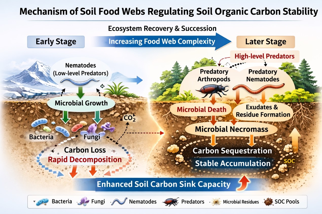 文章针对 Du 等发表于Global Change Biology(2025, 31: e70642)的研究成果进行综合评述。该研究基于青藏高原两个长期生态演替序列,通过分子生物学与食物网结构分析揭示:随着生态系统恢复与演替推进,土壤食物网结构由简单向复杂演变,高营养级捕食者比例逐渐增加,这种结构变化显著影响微生物碳分配与周转路径,使更多碳以微生物残体形式积累,而微生物残体被认为是形成长期稳定土壤有机碳的重要来源。