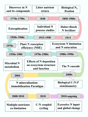 文章综述了氮沉降全球化下森林氮素生物地球化学循环的研究进展,涵盖了大气氮沉降的时空特征、森林氮库与氮状态的变化,以及关键氮循环过程,包括生物固氮、矿化、硝化、同化及其损失途径等。梳理了氮循环研究的历史演进脉络,明确了自19世纪60年代以来的三个不同阶段:阶段I(18-19世纪),基础发现;阶段II(20世纪),机制研究,提出“氮饱和” “氮级联效应”等概念;阶段III(21世纪),聚焦多元素耦合、全球变化整合、可持续发展等。此外,本文探讨了驱动氮循环的核心机制,包括微生物转化过程及植物–土壤互作关系,并重点介绍了森林氮循环的关键理论进展。文章强调未来需加强多因子、多尺度、多学科交叉研究,以及关注氮沉降下降背景下的生态系统恢复机制。通过融合格局、过程与机制三个维度,本综述不仅深化了对人为氮富集下生态系统响应的理解,也为应对全球变化提供了理论支撑。