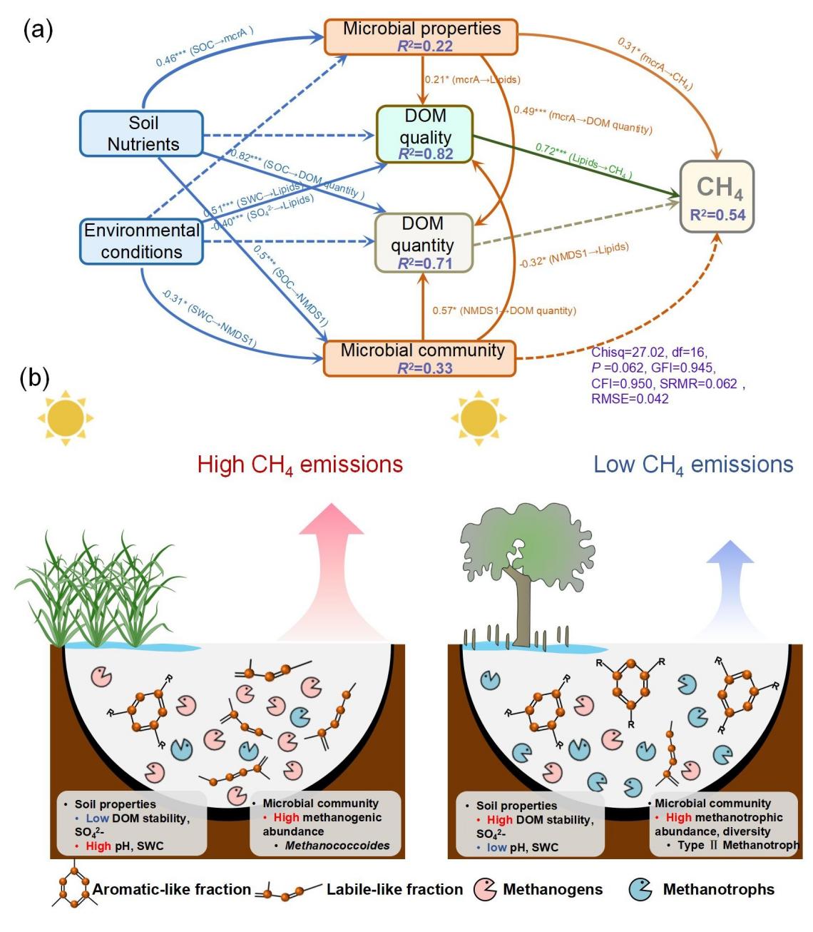 科研团队研究基于珠海淇澳红树林自然保护区,从光滩、互花米草入侵区与原生红树林区开展了一年期原位连续监测,并结合土壤理化性质、溶解性有机质分子组成(DOM)特征以及产甲烷菌与甲烷氧化菌群落结构分析,系统揭示了互花米草入侵对土壤甲烷排放的影响机制。结果表明,与红树林土壤相比,互花米草入侵使土壤甲烷排放量显著升高,其年平均甲烷排放速率约为红树林生态系统的 8.7 倍。进一步分析显示,互花米草入侵导致土壤中可降解有机质组分(如脂类和蛋白/脂肪族类物质)显著增加,而土壤硫酸盐、土壤有机碳和总氮含量下降。这些变化不仅降低了DOM的分子稳定性,还为产甲烷菌提供了更多可利用底物,从而增强甲烷生成过程。微生物群落分析发现,互花米草入侵土壤中产甲烷菌的丰度上升,尤其是能够利用可降解有机基质的 Methanococcoides 相对丰度增加;另一方面,甲烷氧化菌的丰度和多样性下降,尤其是具有高甲烷亲和能力的Ⅱ型甲烷氧化菌显著减少。这种“产甲烷增强”与“甲烷氧化削弱”的协同作用,最终加剧了土壤甲烷的排放,进而削弱了滨海湿地的碳汇功能。