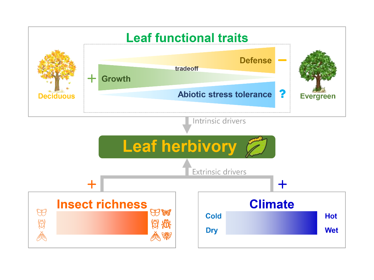 昆虫取食直接影响植物的生长、存活和适合度,并对群落结构、生态系统功能以及生物多样性的维持具有持续影响。过度的昆虫取食会威胁森林的生态保护与可持续发展。然而,不同气候区森林植物叶片虫食率的生理生态驱动机制尚不明确,亟需综合考虑叶片内在性状和外在的生物和非生物影响因子的共同作用(图1)。根据资源可用性假说与叶经济谱理论,资源保守型树种如常绿树种,生长缓慢而防御投资高,推测虫食率较低,但叶片对干热胁迫的耐受性如何影响虫食率尚缺乏研究。同时,资源可用性假说针对环境因子提出,水热条件优越的环境中资源更丰富,植物遭受的虫食率也更高。然而,叶片功能性状(内因)与昆虫丰富度和气候因子(外因)如何共同解释虫食强度的变异仍无明确结论。