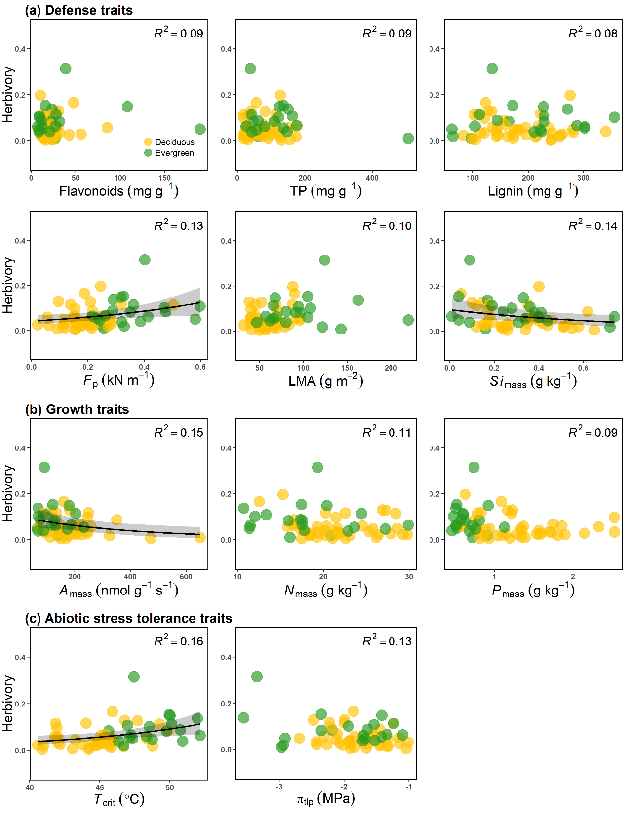 (a)防御性状、(b)生长性状、(c)抗逆性状。橙色圆点表示落叶树种,绿色圆点表示常绿树种。仅贝叶斯广义线性混合模型显著的虫食率-性状关系展示为实线,阴影部分表示95%的置信区间。缩写:黄酮含量(Flavonoids)、总酚含量(TP)、木质素含量(Lignin)、叶片穿透力(Fp)、比叶重(LMA)、单位质量叶片硅含量(Simass)、单位质量的最大光合速率(Amass)、单位质量叶片氮含量(Nmass)、单位质量叶片磷含量(Pmass)、最大量子效率损失15%时叶片经历的温度(Tcrit)、膨压丧失点时的叶片水势(πtlp)。